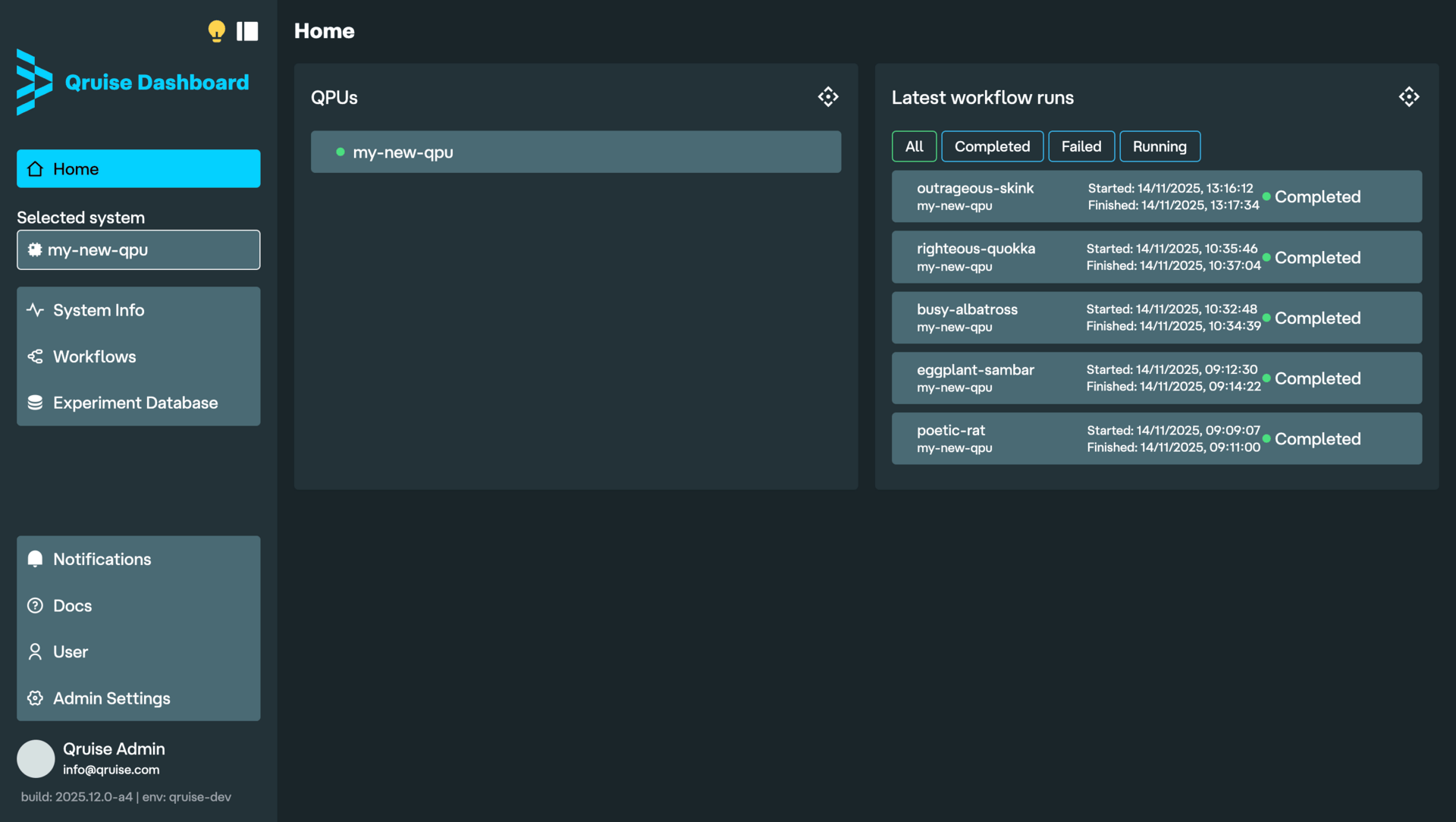 This year, we introduced a revamped dashboard in QruiseOS, making it easy to track workflows, manage QPUs and users, and view historical data. We also added parallelised experiment bring-up, a new command-line interface, workflow definition improvements, the option to export data, and fully reproducible JupyterLab environments. Additionally, there were lots of under-the-hood bug fixes and enhancements focusing on improving usability, performance, and stability.